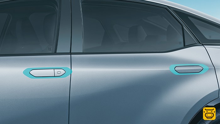 隐藏式内翻门把手(丰田首次采用),超低风阻设计,保障优秀续航,同时无惧冰雪,顺畅开合。